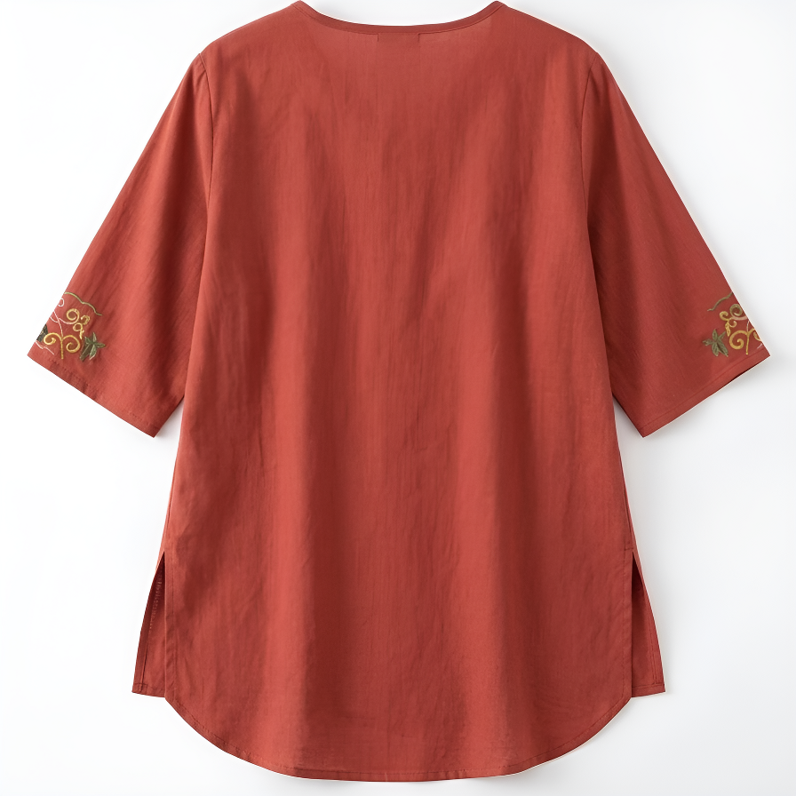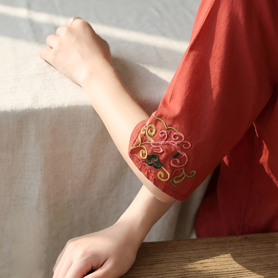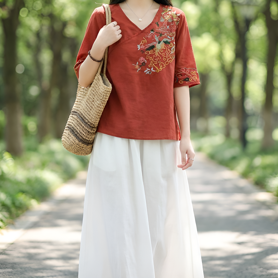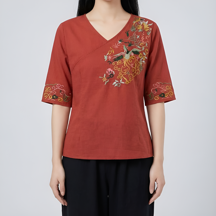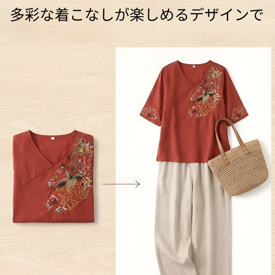 スリム効果レトロ刺繍レディース半袖シャツ