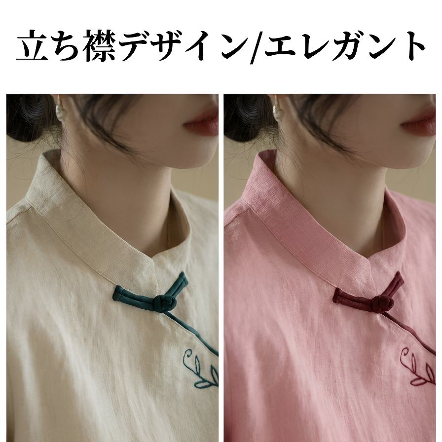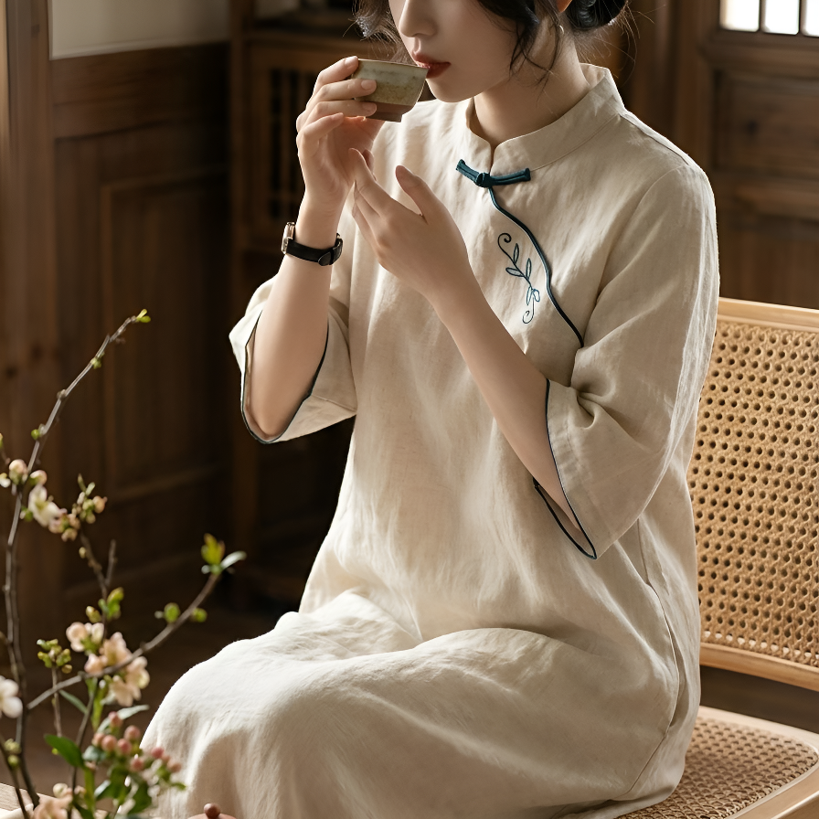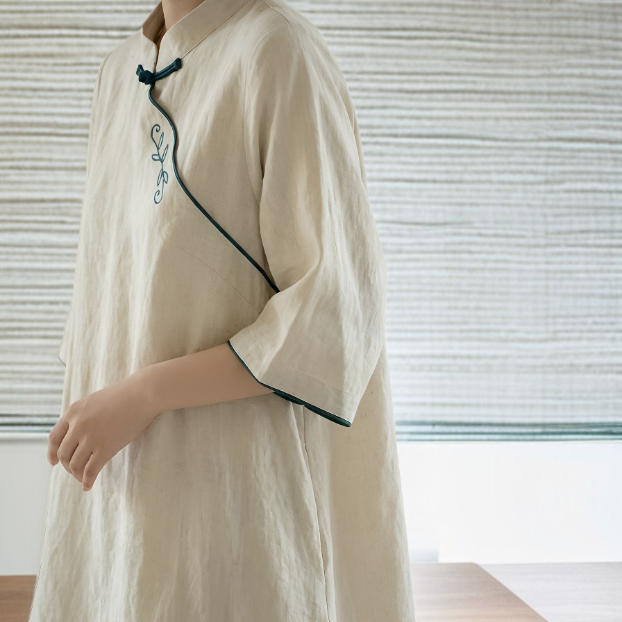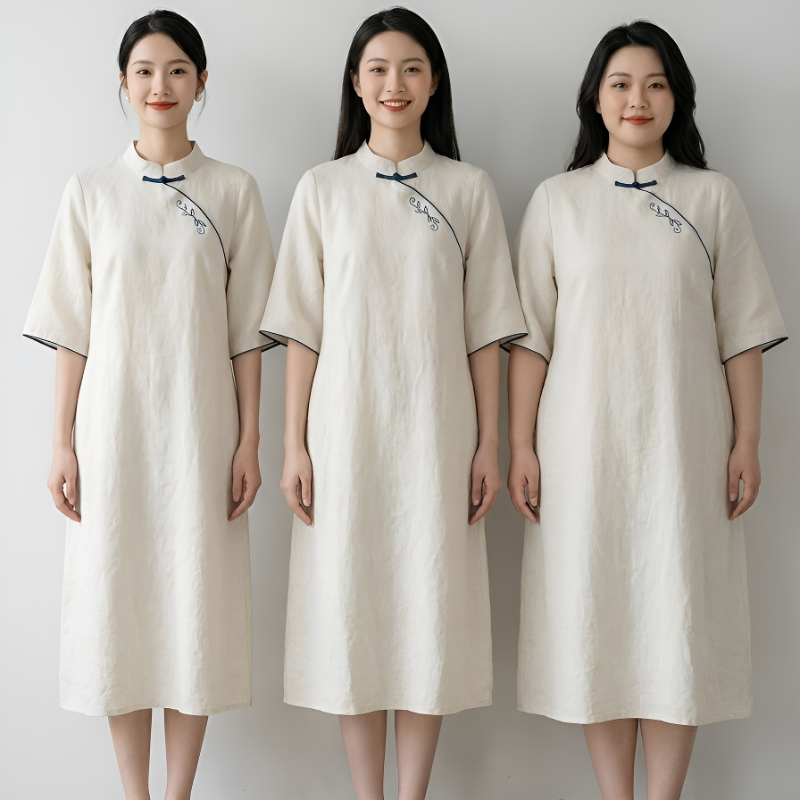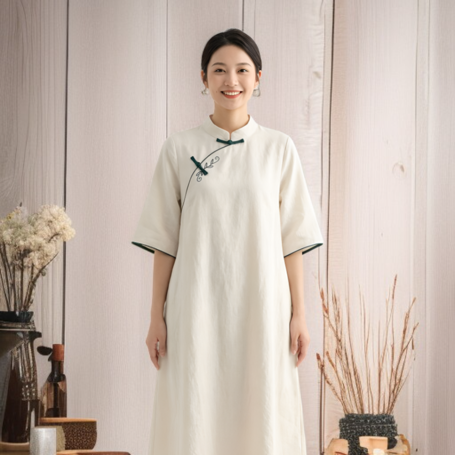 白 ゆったり綿麻チャイナドレス レディース 若者向け 改良型ロングローブ